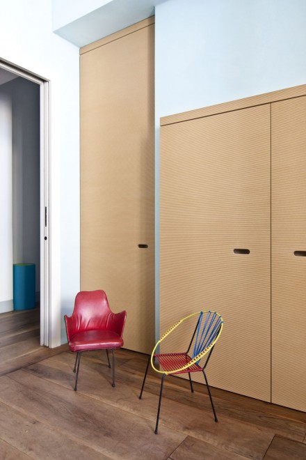 The big bookcase-storage, designed by Paolo Morsiani – IABLU leads as a trail to the principal bedroom. Birch geometrical draws, books and light break the size and the impact of this big furniture.