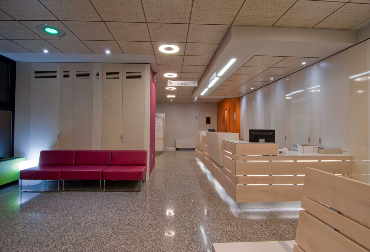 Punto focale è la reception che con l’illuminazione integrata è di grande effetto scenografico.